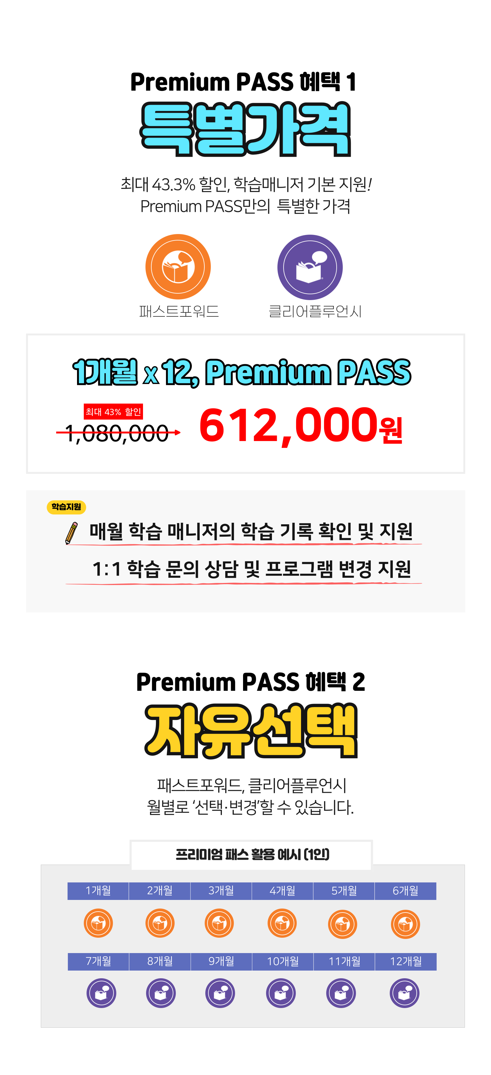 FAST FORWORD(패스트포워드) 기간별 이용 계정, Weekly 또는 Daily Report, 학습매니저 지원, (희망시) RPI 레벨테스트, (유료옵션)전문코치의 코칭